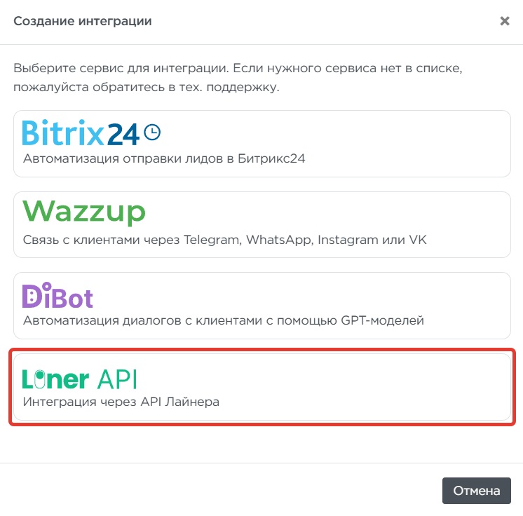 После сохранения настроек можно подключить стороннее приложение к Liner и начать обмен данными через API.
