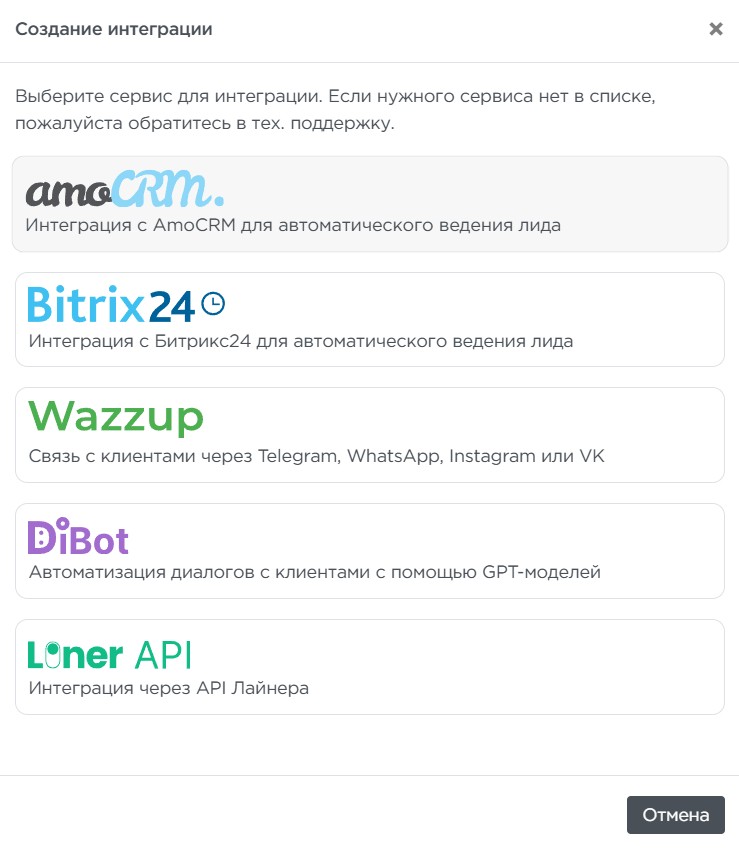 Интеграция позволяет передавать лиды из Liner в AmoCRM с возможностью настройки назначения ответственных и сопоставления полей.