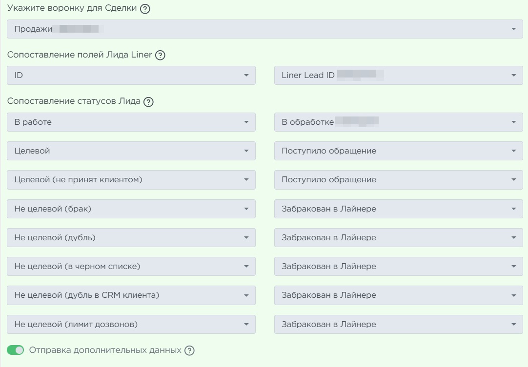 Включите переключатель Отправка дополнительных данных, чтобы передавать дополнительные параметры лида из Liner, если такие поля будут найдены в Amo.