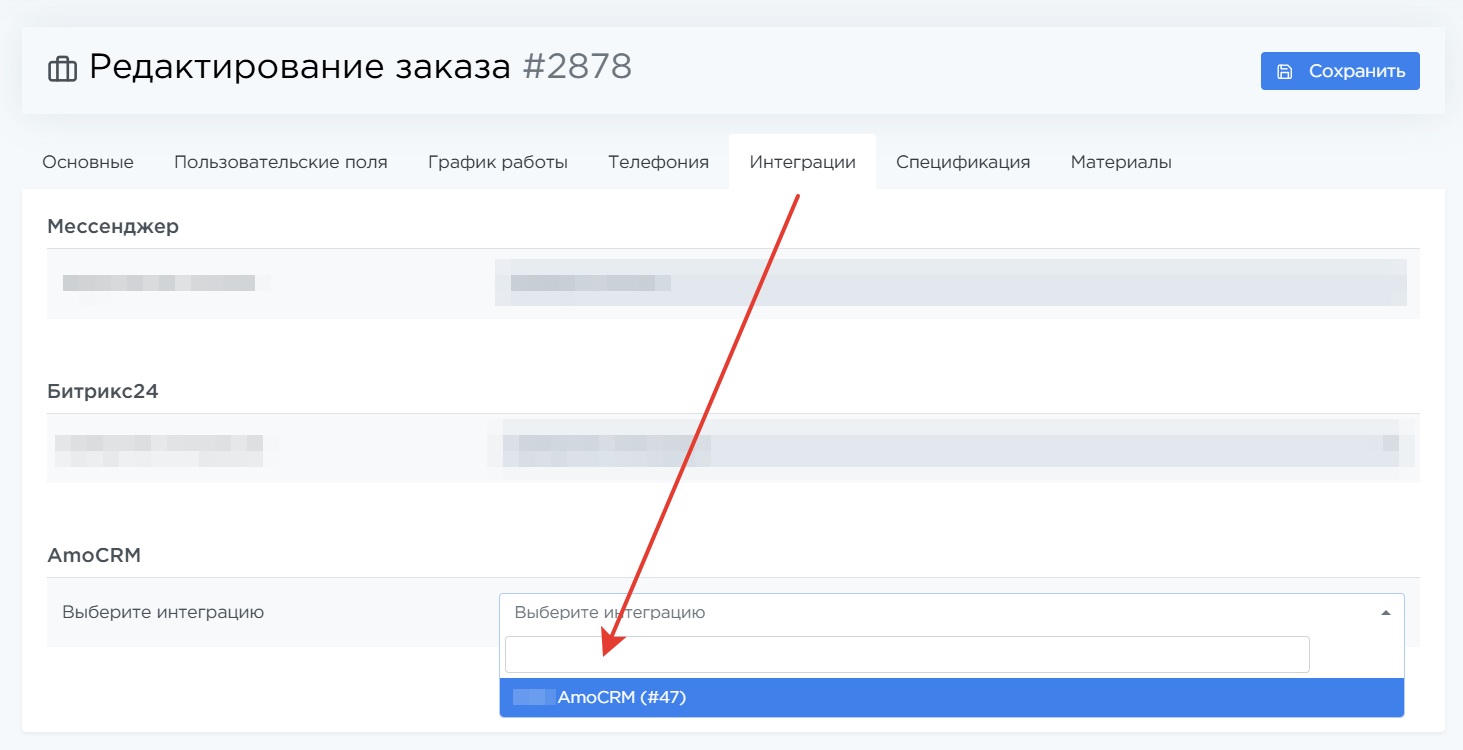 Откройте нужный заказ → Редактировать → вкладка Интеграции