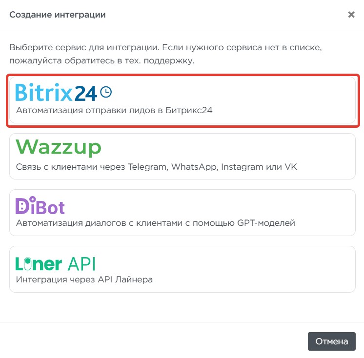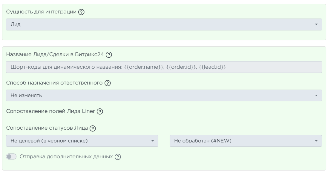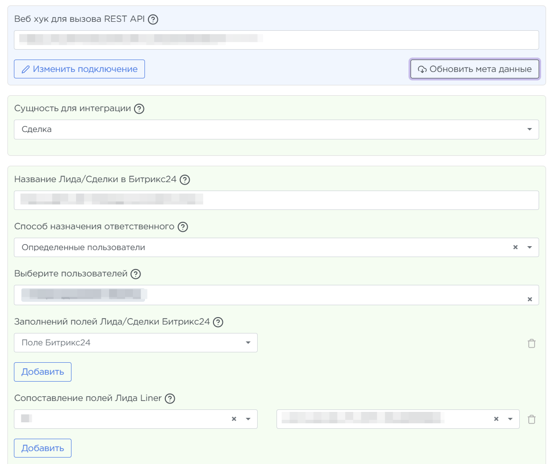 Интеграция позволяет передавать лиды из Liner в Битрикс24 через REST-вебхук с возможностью настройки назначения ответственных и сопоставления полей.