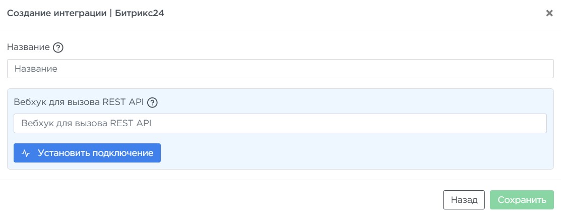 Создайте вебхук в Битрикс24, вставьте его в поле Вебхук для вызова REST API и нажмите Установить подключение.