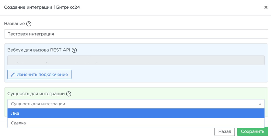 При выборе «Лид» в Битрикс24 будут созданы лиды, при выборе «Сделка» — сделки.