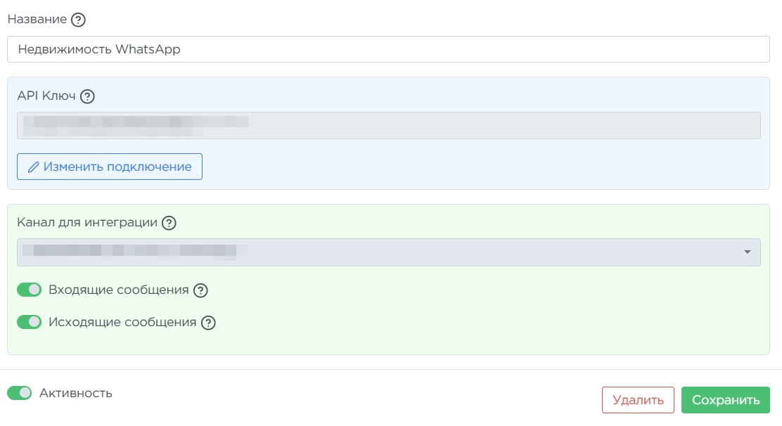 Чтобы удалить интеграцию, откройте её настройки и нажмите кнопку Удалить.