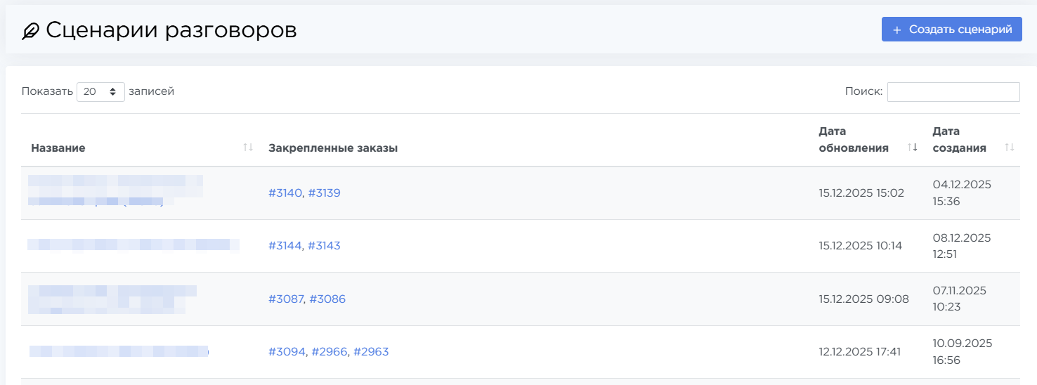 Страница Параметры → Сценарии разговоров предназначена для создания, редактирования и просмотра сценариев, по которым операторы ведут диалог с лидами. Сценарии используются в заказах и помогают стандартизировать коммуникацию, сократить время обучения операторов и повысить качество обработки лидов.