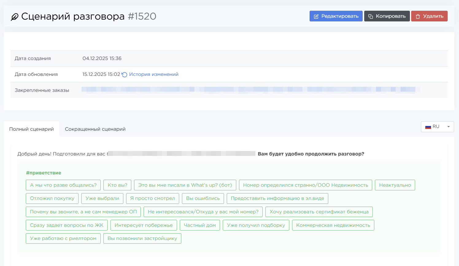- Закреплённые заказы — ID заказов, в которых используется сценарий. Каждый ID кликабелен и ведёт на страницу заказа.