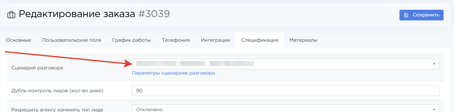 Сценарий разговора выбирается в настройках заказа, в блоке Спецификация → Сценарий разговора. После выбора сценария оператор будет видеть его при обработке лидов по этому заказу.