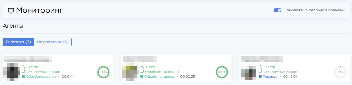 В верхней части страницы отображается список всех агентов на двух вкладках: Работают и Не работают. На карточках агентов показаны статус, режим обработки звонков, текущая занятость и её время (процесс разговора, пост-обработка звонка, перерыв и т.д.), а также процент загрузки.