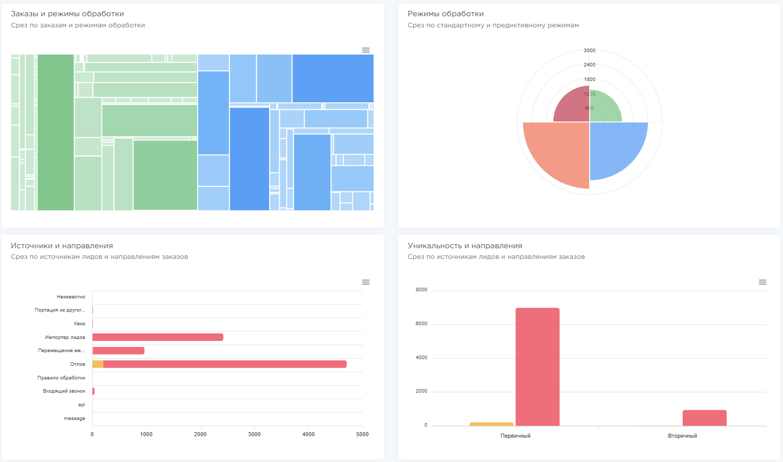Режимы обработки — количество активных и приостановленных лидов в стандартном и предиктивном режимах. При наведении на сектор показана аннотация,