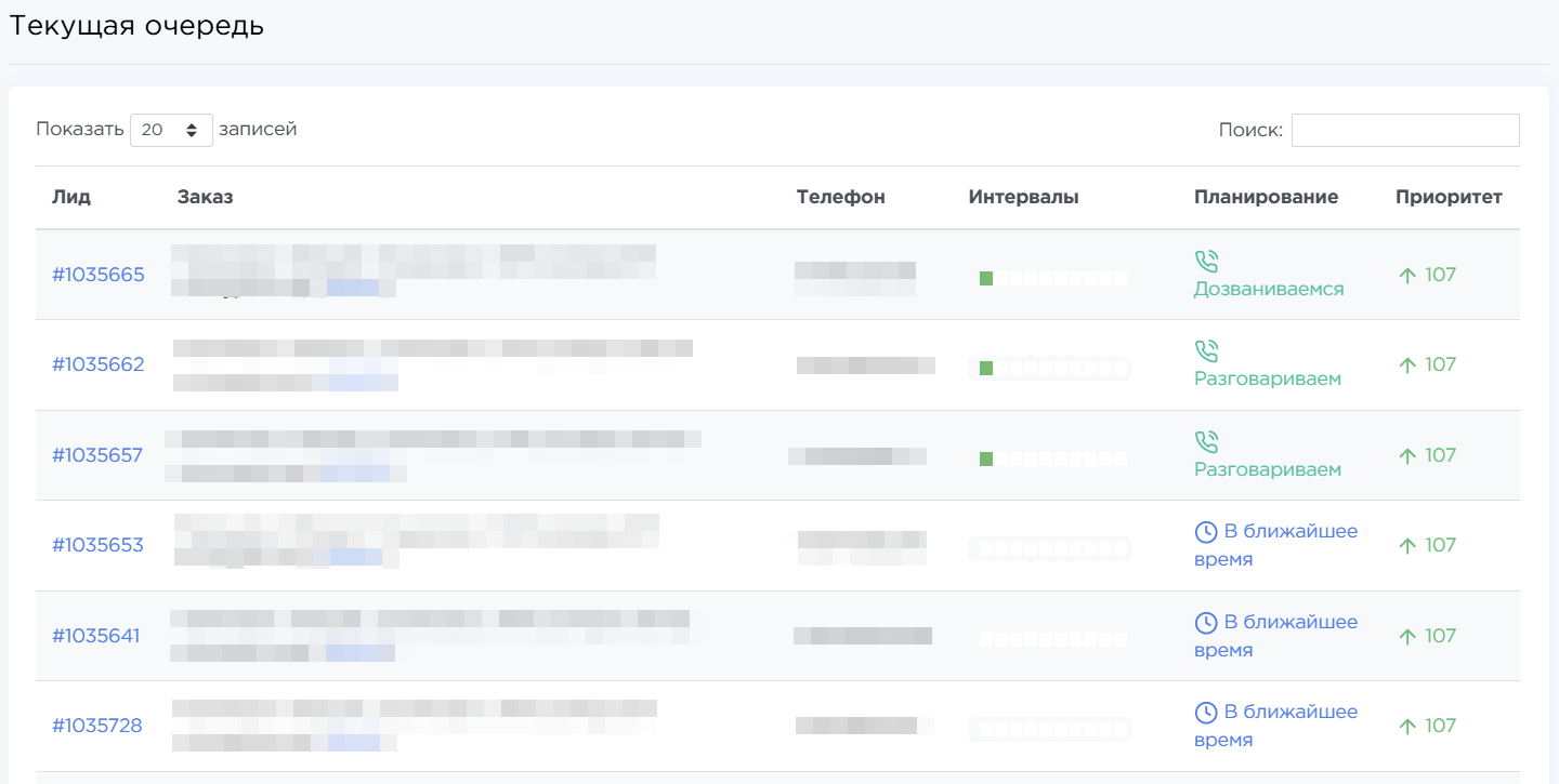Здесь показаны ID лида, название и ID заказа, телефон лида, интервалы (попытки дозвона), планирование (текущее состояние дозвона: разговор, ожидание обработки и т.д.), приоритет.