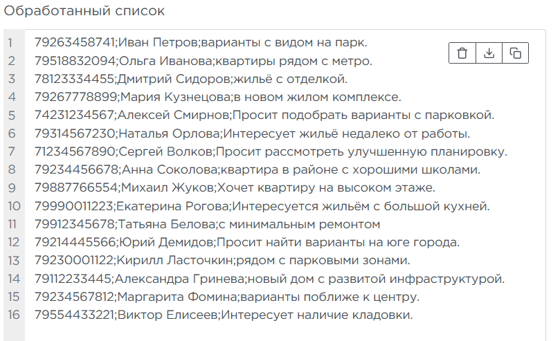 Номер телефона;Имя;Комментарий - Удалить лишние символы из номера телефона — процессор удалит дефисы, скобки и прочие символы из номеров и приведёт их к эталонному виду