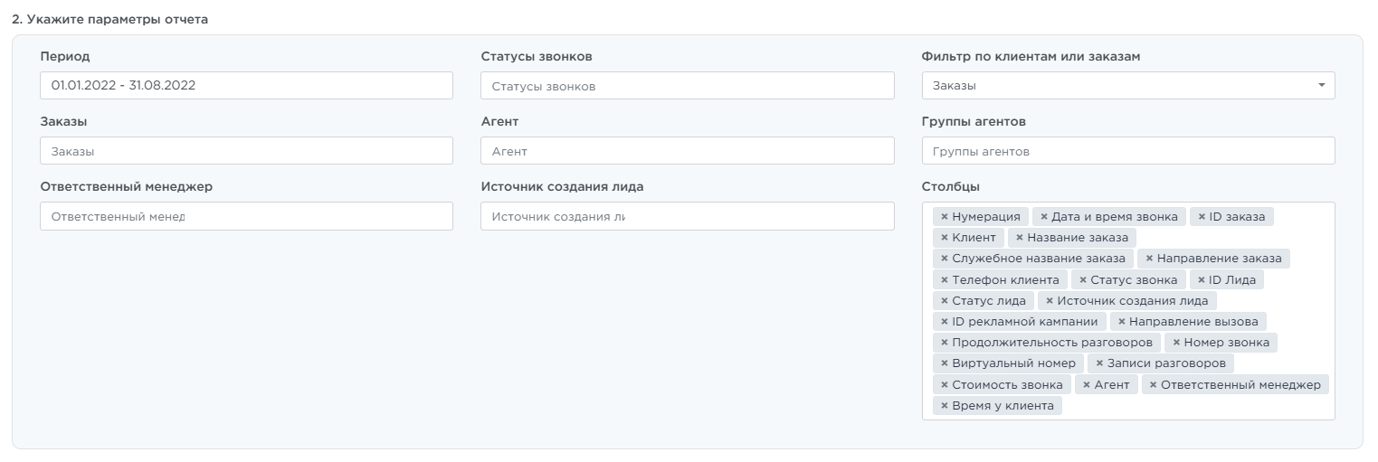 Чтобы сформировать отчёт, укажите параметры. Их набор зависит от типа отчёта, но логика работы едина.