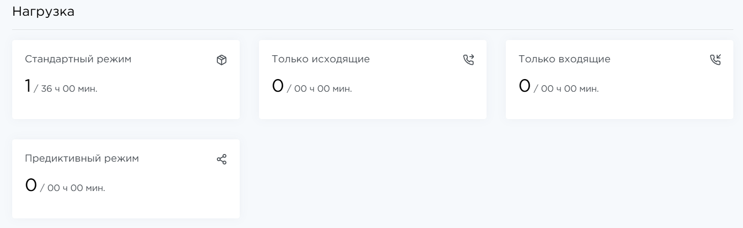 В карточках указано, в каких режимах обзвона задействованы выбранные операторы, и какая общая нагрузка за период в этих режимах.