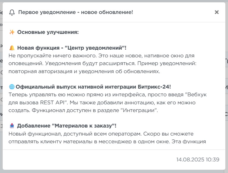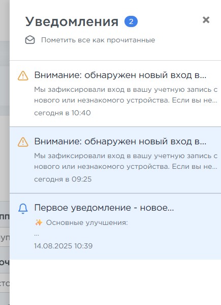 Центр уведомлений предназначен для информирования пользователя о важных событиях в системе. Сейчас уведомления приходят о выходе новых обновлений, о входе в аккаунт с нового устройства и о проблемах с интеграциями.