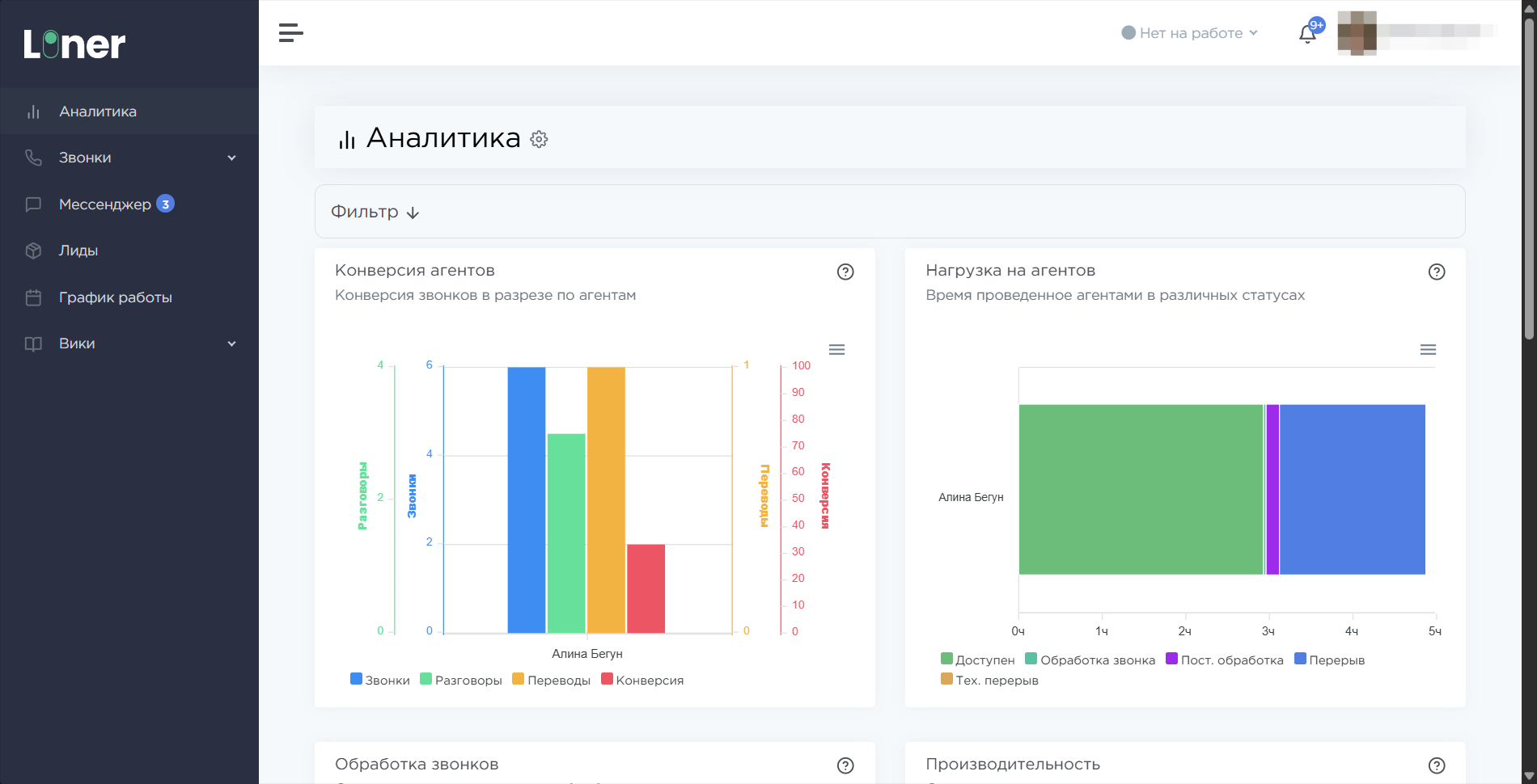 После авторизации в системе открывается страница Аналитика. Здесь вы можете увидеть сводную информацию о ваших показателях за смену и личную эффективность. Подробнее о графиках читайте в статье Аналитика.
