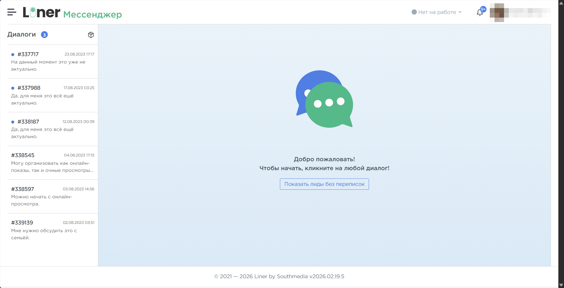 Когда клиент присылает новое сообщение, в разделе Мессенджер появляется счётчик непрочитанных диалогов.