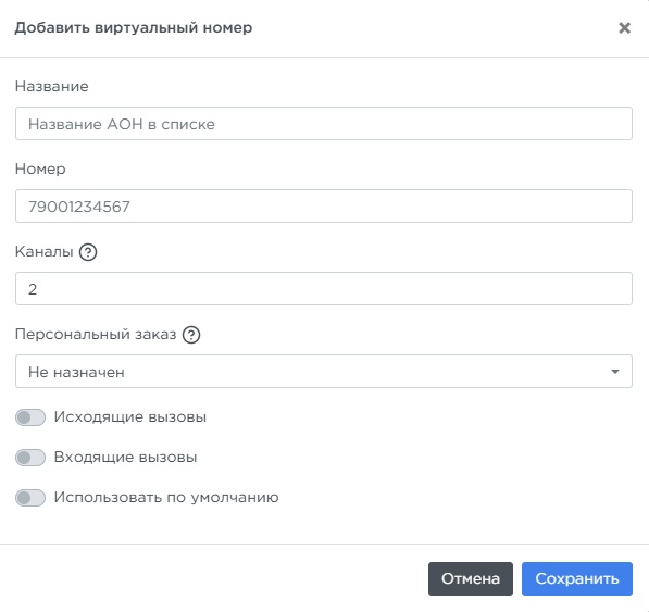 - Перейдите в раздел Виртуальные номера → Добавить.