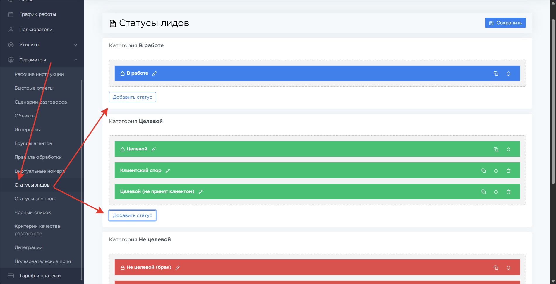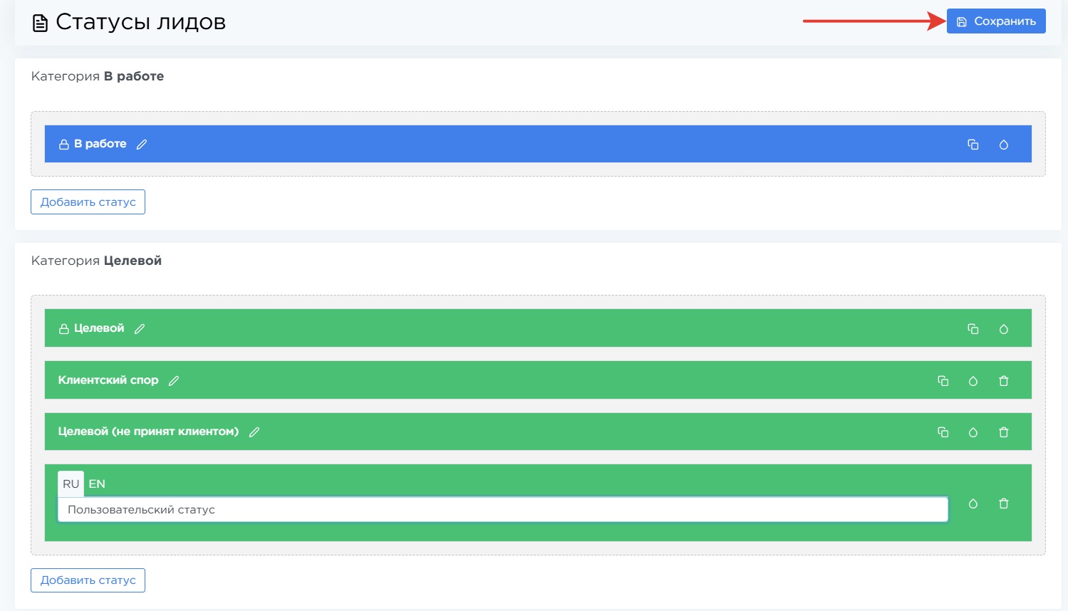 - Категория Целевой — обработка лида с любым статусом из этой категории считается завершённой успешно для аналитики.