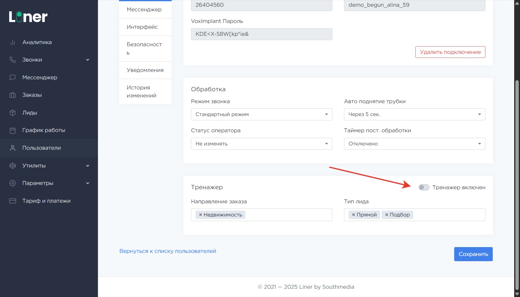 После нажатия кнопки Сохранить у оператора запустится тренажёр. Отключается тренажёр аналогичным способом.