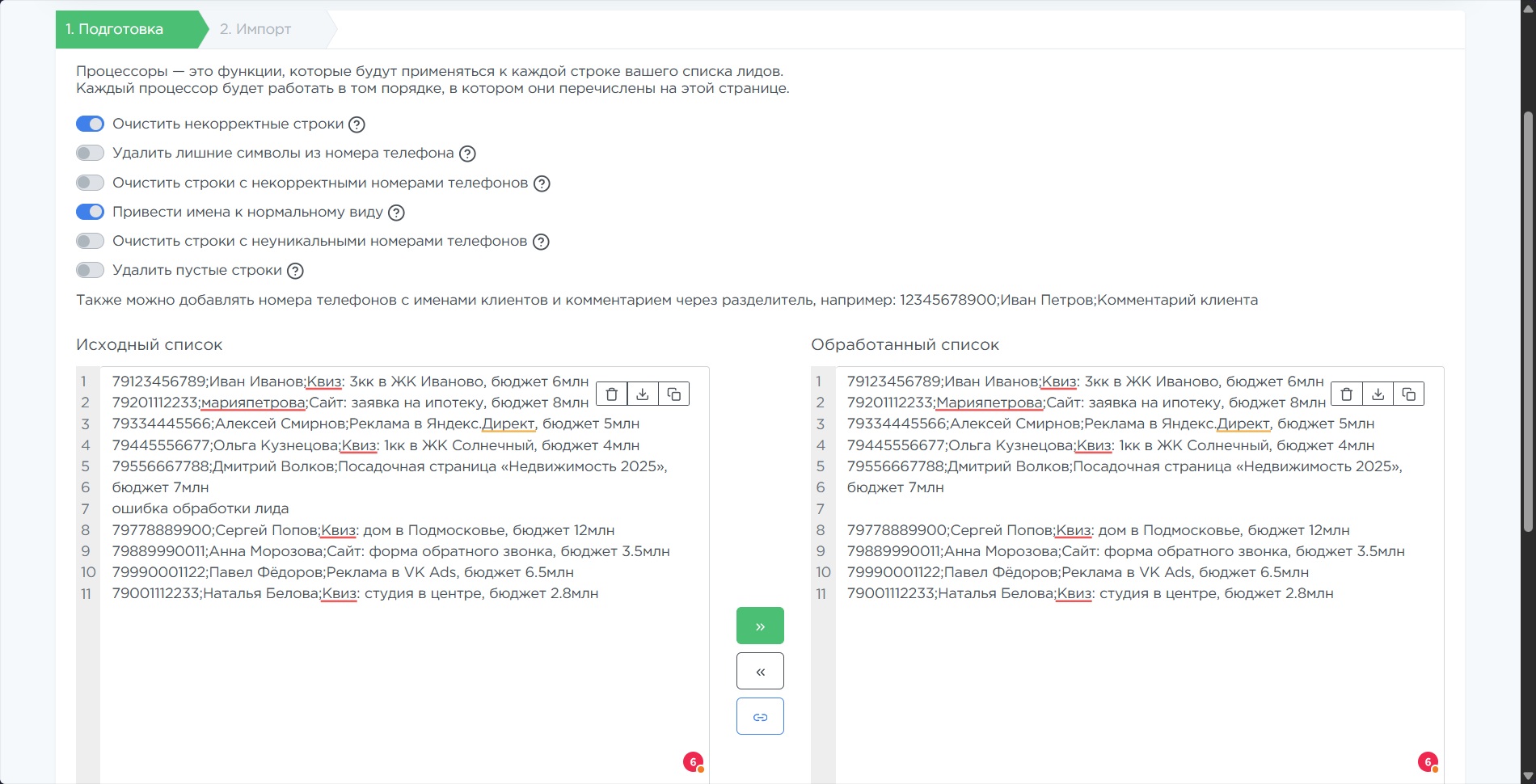Вставьте построчно список лидов из источника (например, CSV) в формате