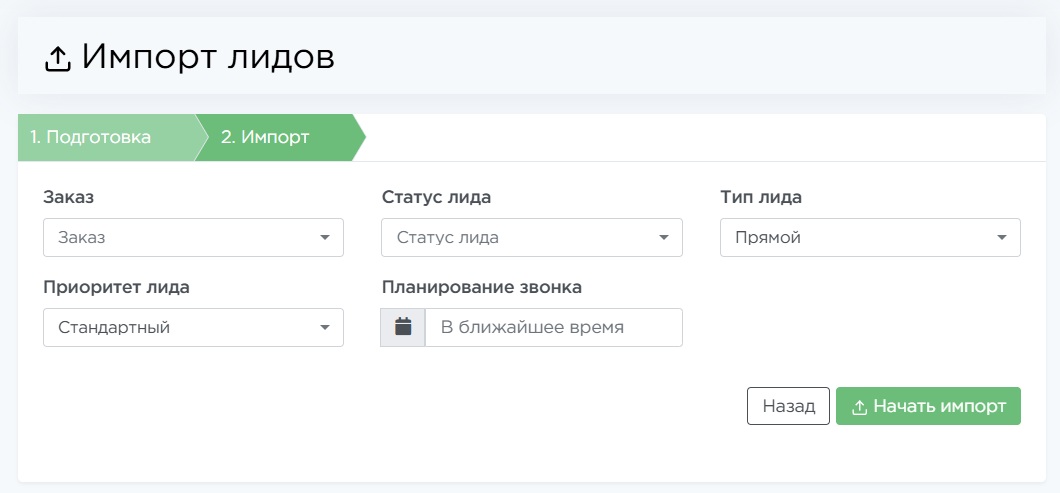 Планирование звонка — оставьте поле пустым, чтобы обзвон лидов начался сразу после импорта (если статус заказа это позволяет), или выберите день и время, когда начать обзвон.