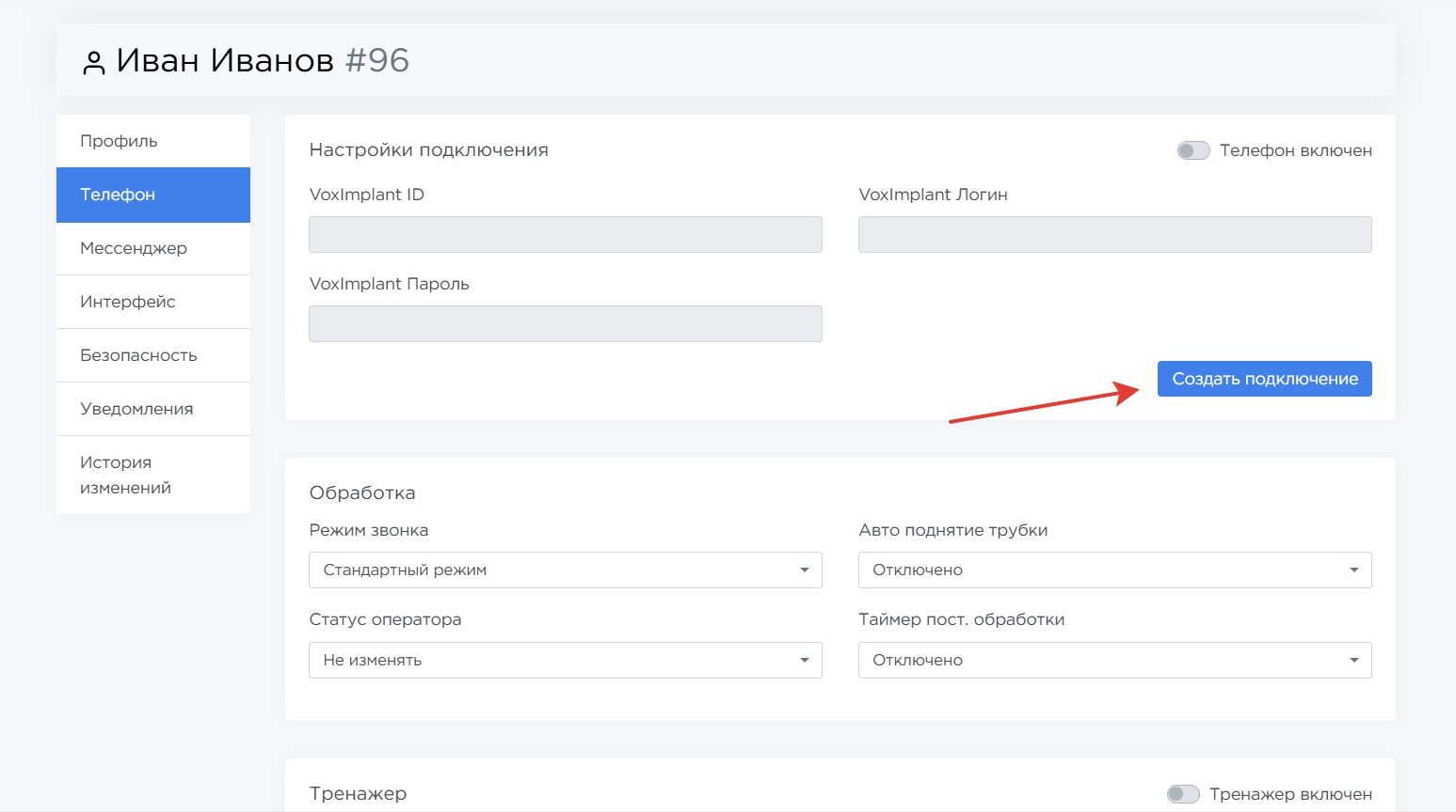 В поле разделе Настройки подключения нажмите Создать подключение. Система автоматически создаст в VoxImplant пользователя и подтянет его данные в Liner.