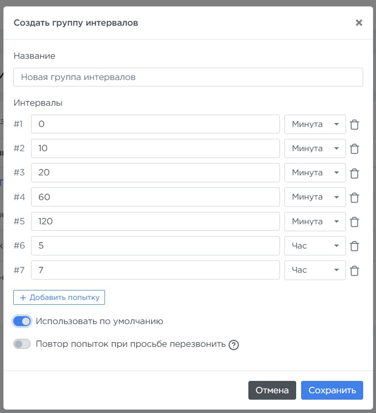 Интервалы — последовательно добавляйте попытки дозвона, указывая промежуток времени, который пройдёт от предыдущей попытки. Рекомендуемые параметры: