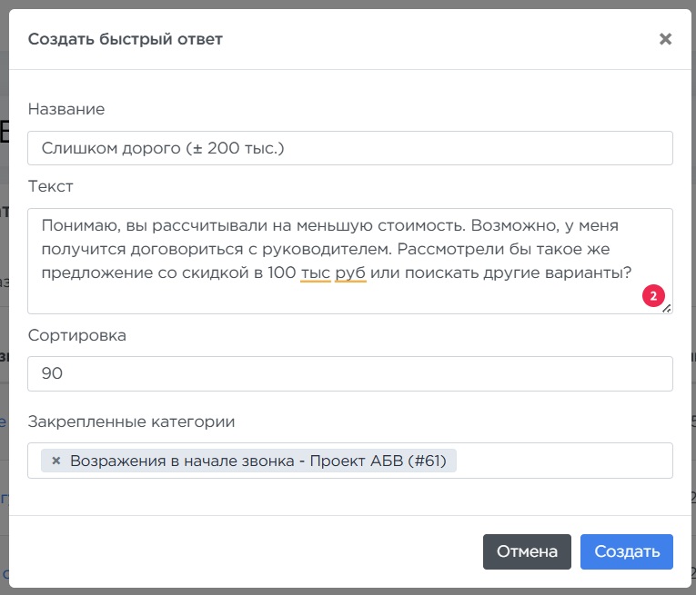 Название ответа — как правило, здесь указывают фразу клиента, на которую нужно ответить, например, «Слишком дорого».
