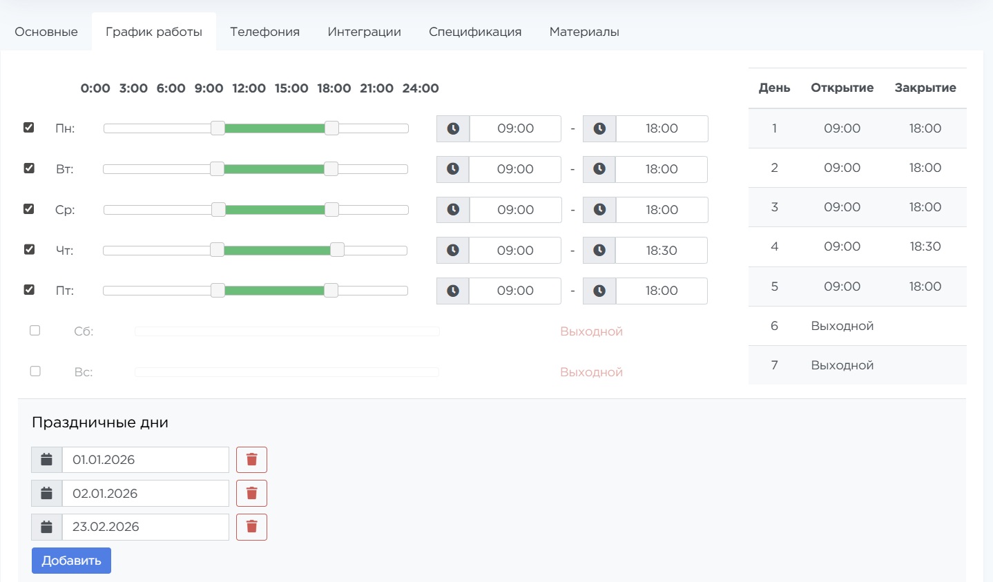 Для каждого дня укажите с помощью ползунков время, в которое будут осуществляться звонки лидам по заказу.